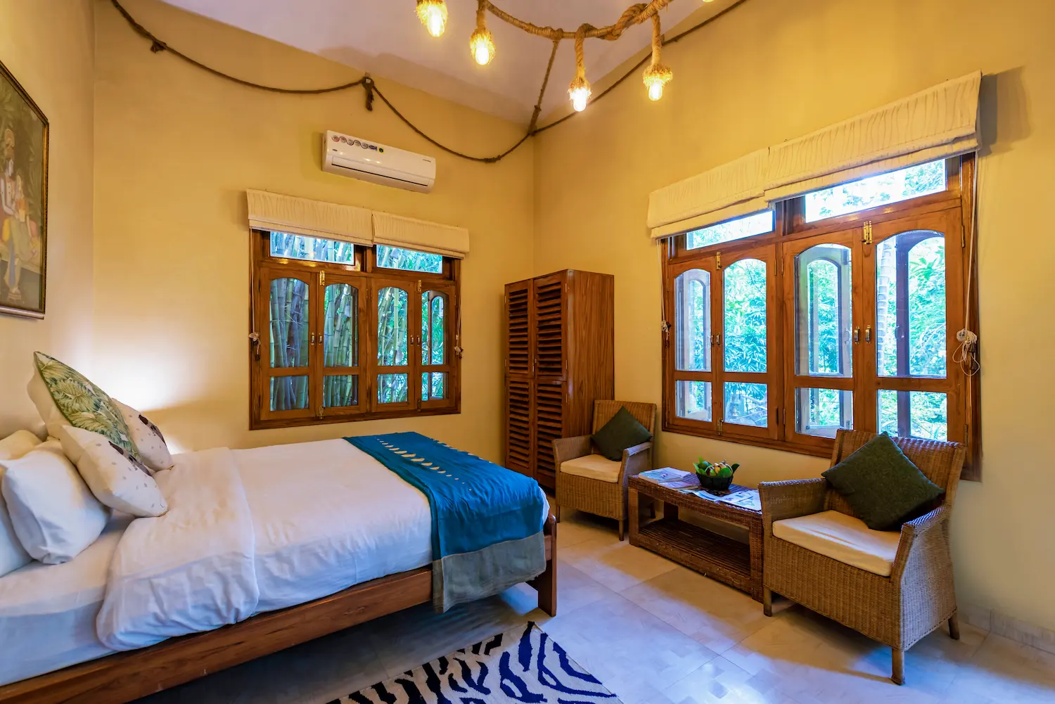 Designed for passionate wildlifers, wildlife photographers and solo travellers, the two ‘long stay’ rooms are cozy with all the modern amenities and yet pocket friendly. Rejuvenate and relax as you plan a longer vacation to explore the wildlife of Pench or simply getaway from the hustle bustle of the city life. The finer details: 2 semi safari rooms 150 sq. ft. built up area with a queen sized bed En-suite bathrooms with 24 hours hot & cold water, power backup and complimentary organic toiletries Air conditioner and intercom Heaters for the winters Sitting chairs Tea & coffee making facilities Minibar Insect repellent Complimentary WiFi in common areas Laundry service 24 hour front desk